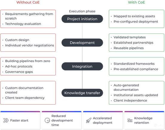 For companies working with diverse AI domains, a CoE is the most reasonable mechanism for maintaining coherence across a growing AI portfolio. It lets teams build high-leverage capabilities once and compound value across projects. To be specific, a dedicated Center of Excellence model benefits in the four areas: