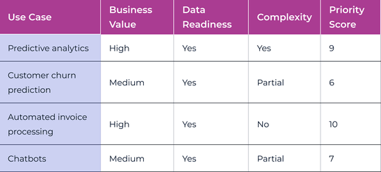 - Priority Score is calculated using a formula: Business Value × Data Readiness × Complexity Factor or a weighted scoring system.