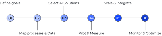 The best practice is to deploy AI solutions in controlled phases. So, start with small pilot programs in low-risk, yet high-impact areas to demonstrate the immediate value. Then, continue with proof-of-concept implementations lasting 30-60 days, followed by department-wide rollouts.