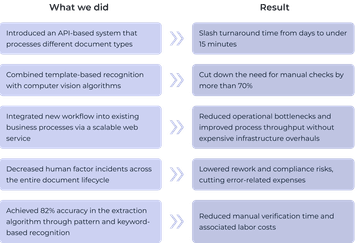 From our experience, HR and financial process automations top the demand list because they offer clear ROI, standardized workflows, and regulatory compliance benefits that appeal to executives looking for measurable wins and ways to reduce operational costs. Talking about quantifiable outcomes, here’s one of our clients’ stories about an automated document parsing solution.